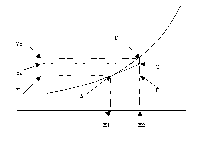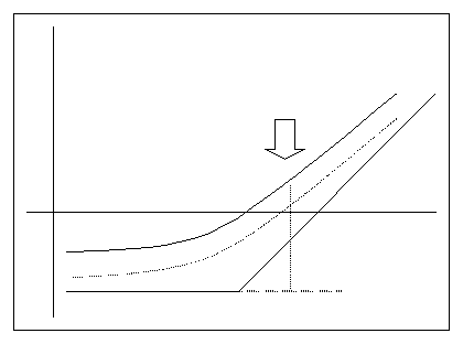 図5の例では、X1(100万円)からX2(110万円)へスポット価格が上昇、オプション価格はY1(30万円)からY3(38万円)まで上昇した。一方、デルタ・ポジションは、0.5単位売りもちにしているので、10万円のスポット上昇に対して5万円の損失が出る。オプション価格からは8万円の利益、デルタ・ポジションから5万円の損失であるから、差し引き3万円の利益が出る。これが図5ではCDで表される誤差である。もし、X1とX2の距離が充分に小さければ、誤差も小さくなることは図からも読み取れるであろう。なぜ誤差が生まれるか、どの程度の誤差が生まれるかを表したものがガンマ(デルタをさらにスポットで編微分した係数)である。ガンマについては、本稿では触れない。