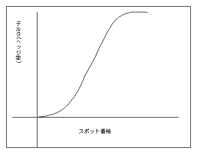 で与えられる。これをデルタというが、A地点におけるデルタが0.5であるとする。つまり、このオプションの価格は、スポット価格が変動する半分の割合で増加する(スポットが100円増加すれば、オプション価格は50円増加する)ことになる。