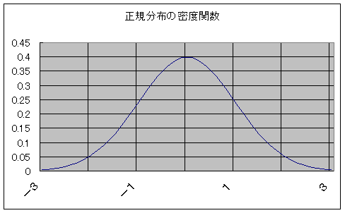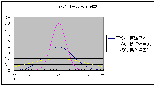 図補1の中で、平均0、標準偏差1のグラフが、標準正規分布を示している。青色の線の場合は、平均は同じに設定してあるが、標準偏差を半分にしてある。標準偏差が小さいということは、平均を中心にして散らばりが小さいということである。逆に、黄色い線で示されたグラフは、大きな標準偏差の例である。標準偏差が大きいということは、平均を中心として散らばりが大きいということである。