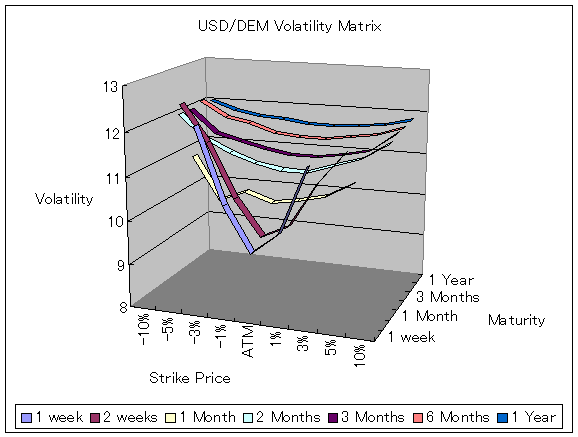 本文中、オプションの価格の項において、オプション価格は、需要と供給で決定されると書いた。オプション価格は前述のように、スポット価格、金利、権利行使価格、期間、ボラティリティーで決定される。これら変数の中で、オプション・マーケットで独自に決定されるのが、ボラティリティーである。金利やスポット相場においては、オプション・プレイヤーは市場の一参加者に過ぎない。したがって、オプションの需給を最も大きく反映する変数はボラティリティーであるといえるだろう。