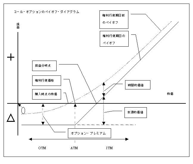 the Money、ATMはAt The Money、ITMはIn The Moneyの略。あるスポット価格におけるオプションの価値は本源的価値と時間的価値の和として表される。本源的価値(Intrinsic