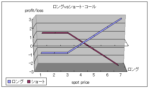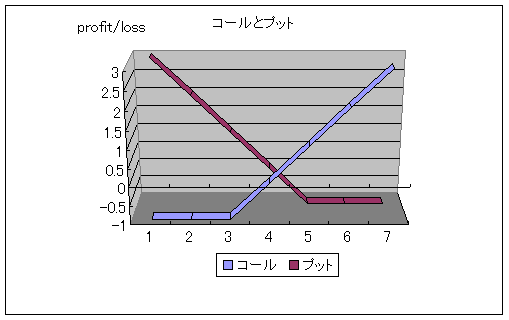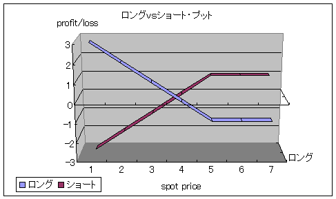 図2の説明においては、何ら説明を加えることなく、オプションのペイオフ・ダイアグラムであると説明したが、正確には、コール・オプションをロング(買い持ち)と、プット・オプションをロングにした場合のペイオフ・ダイアグラムである。オプションを全くの素人に説明をする際に、いちばん分かってもらいにくいことがオプションの売りと買いの区別である。コール・オプションとは、買う権利である。買う権利を売るとは、どういうことか、買う権利を売ることは、売る権利を買うことと同じか、といった疑問が、必ず出てきた。また、オプションのペイオフ・ダイアグラムは上記のように、途中で折れ曲がっている。したがって、損益のプロフィールが対象になっていない。これもオプションを理解しづらくしている原因であろう。