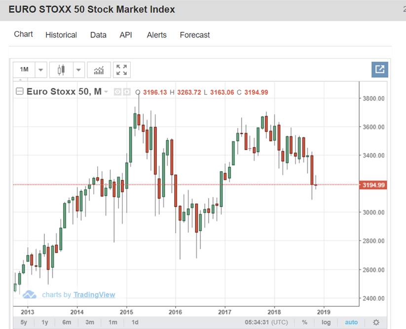 ユーロ圏の上位銘柄によって構成される株価指数であるSTOXX 50ですが、2018年度は下落傾向を示しています。