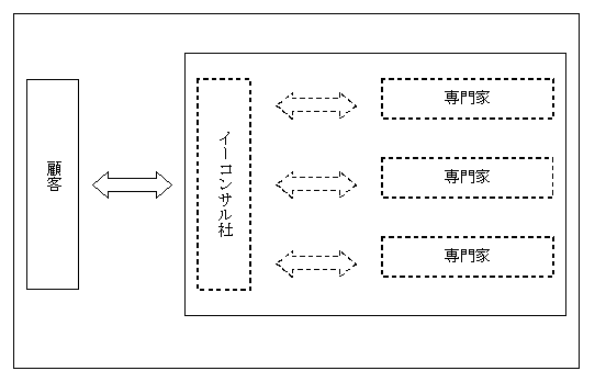 第二のメリットは、顧客側にもたらされる。いわゆる士族、先生達は気位が高く、独立した事務所を構えている一匹狼であるために、悪い言い方をすればプロらしくない人種が少なからず含まれていた。実際にある業務を依頼したいと思っても、どこの誰がその分野の専門家であるのか分からず、いったん依頼してしまえば、いささかの不平不満があろうとも、担当を取り替えるなどということは考えられなかった。とにかく先生のご機嫌を損ねずに仕事をしていただかなくてはならなかったからである。ところが、イーコンサル社のような法人化された専門組織が仲介することにより、案件ごとにそれにふさわしい専門知識をもった専門家、あるいはそのチームを気兼ねすることなく使えるようになる。