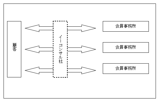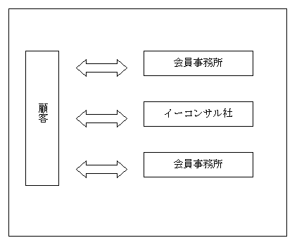 イーコンサル社の組織は、理念的には図1のような構成をとるものである。しかしながら、前述のような法的な要請により、実際の法律関係においては図1に示された組織には当てはまらない構成を採らざるを得ない。例えば、顧客からの依頼事項が法律問題である場合には、それに対する回答が文書で行われるにしろ口頭で行われるにしろ、弁護士がその名のもとに行う必要がある。例えイーコンサル社が依頼事項を受け付けたにしろ、現実の契約関係は顧客と法律事務所の間で発生していなくてはならず、その回答も弁護士が行わなくてはならないことになる。イーコンサル社の名のもとに回答することは弁護士法違反に当たる。従って、実際の案件に対しては、図2に見るように、個別の契約をそれぞれの業法の規定にのっとり結んでいただく必要がある。これは顧客にとっては従前の顧客、事務所間の関係と何ら進歩するところがないものであるが、現在の法的規制の下ではやむをえないものであると考えられる。