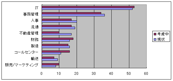 図1に見られるように、アウトソーシングする機能の主流はなんといってもIT分野であるが、その他事務管理、人事を含め、経営の中枢業務である意思決定作業を除くあらゆる分野でアウトソーシングが取り入れられている現状がお分かりいただけるものと思う。