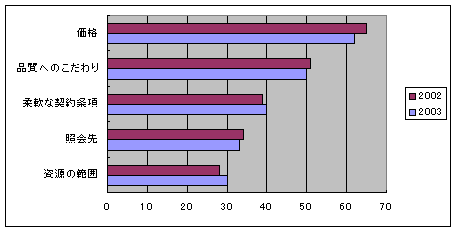 同様の傾向はサービス提供業者を選択する際に重視する要件(図3)にも現れている。価格を最重要視するのはもちろんであるが、品質、将来を見越した柔軟な契約要件なども充分考慮されている。アウトソーシングが短期的なコスト削減だけではなく、長期的な事業戦略に基づいて選択されていることが伺える。
