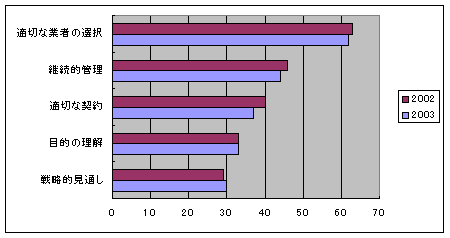 図5に見るとおり、最も重要なファクターとして挙げられているのは適切なサービス提供業者を選択することであるが、次に重要視されているのは、継続的な管理である。アウトソーシング契約というのは締結してアウトソースされた業務が始まった後も、継続的な見直しを行ない、問題が発見された場合、改善策が取られなくてはならない。そしてアウトソースしている期間を通じてこのプロセスが繰り返されるのである。