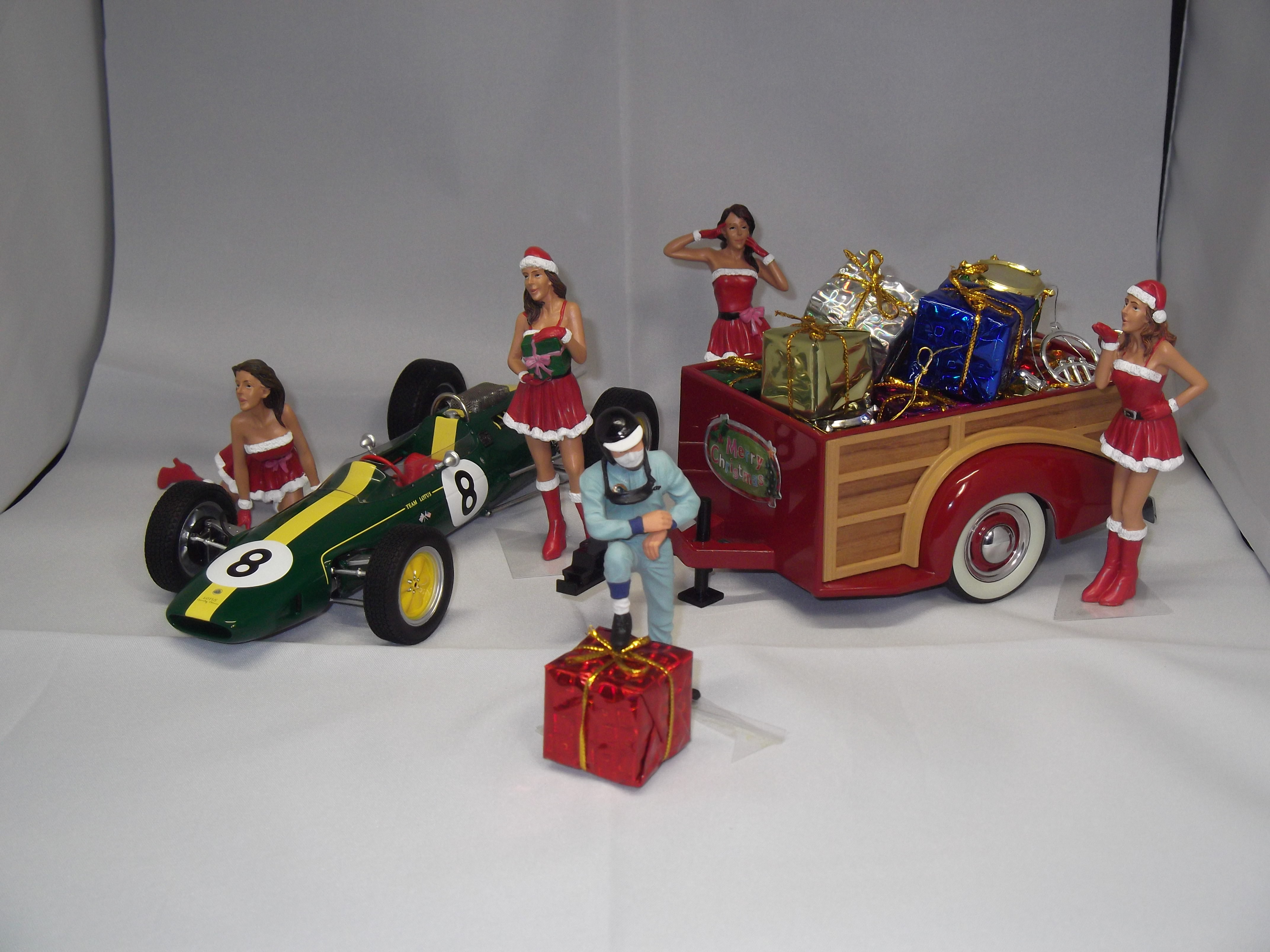 Made a imaginary scene of show of Classic Team lotus. Lucky Strike color Lotus 72 with Dave Charlton figure, Lotus 49 with Graham Hill figure, and Lotus 25 with Jim Clark standing figure.