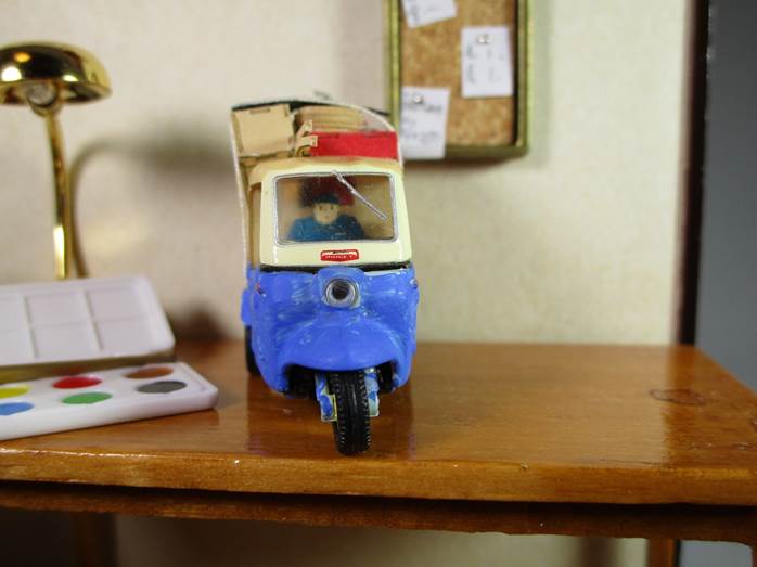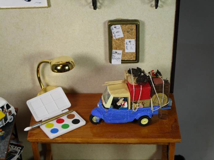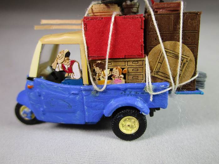 三輪トラックにはお父さん、サツキとメイが机の下に隠れてます。メイちゃんとかの顔の幅は2〜3ミリ。娘に塗ってもらいました。さすが美大卒。老眼じゃ見えないもんね。
